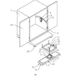 參照圖1,包括殼體1、工作臺2、盛液盒3和標準板4,殼體1內設置有工作腔5,殼體1底部設置有多個支撐腳20,在本申請實施例中,支撐腳20設置為四個,四個支撐腳20設置于殼體1的四角位置;殼體1上鉸接有兩轉動門22;工作臺2設置于工作腔5內,工作臺2上開設有與盛液盒3適配的放置槽21,盛液盒3可放置于放置槽21中,標準板4設置于盛液盒3上方,標準板4通過升降結構可升降連接于殼體1上,工作臺2上固定連接有水平儀6,在本申請實施例中水平儀6選用氣泡式水平儀,也可選擇其他體積較小的水平儀;工作臺2和殼體1之間設置有用于調平工作臺2的調平結構。