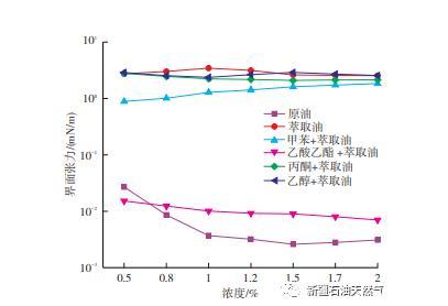 圖4為原油、萃取油以及萃取油分別添加濃度為1%的甲苯洗脫物、乙酸乙酯洗脫物、丙酮洗脫物、乙醇洗脫物配成的模擬油與0.5%,0.8%,1%,1.2%,1.5%,1.7%,2%這七種濃度Na2CO3的界面張力。可以看出,乙酸乙酯洗脫組分與堿的界面張力最低。隨著Na2CO3濃度變大,界面張力也持續(xù)降低,當Na2CO3濃度達到2%時,其界面張力達到10-3 mN/m。孫景倫等研究了復合驅(qū)油體系中堿與原油的相互作用,發(fā)現(xiàn)Na2CO3更易于環(huán)烷酸以及苯環(huán)和不飽和酸部分反應(yīng);與飽和酸相比,環(huán)烷酸以及苯環(huán)和不飽和酸的界面活性更強,導致界面張力更低。