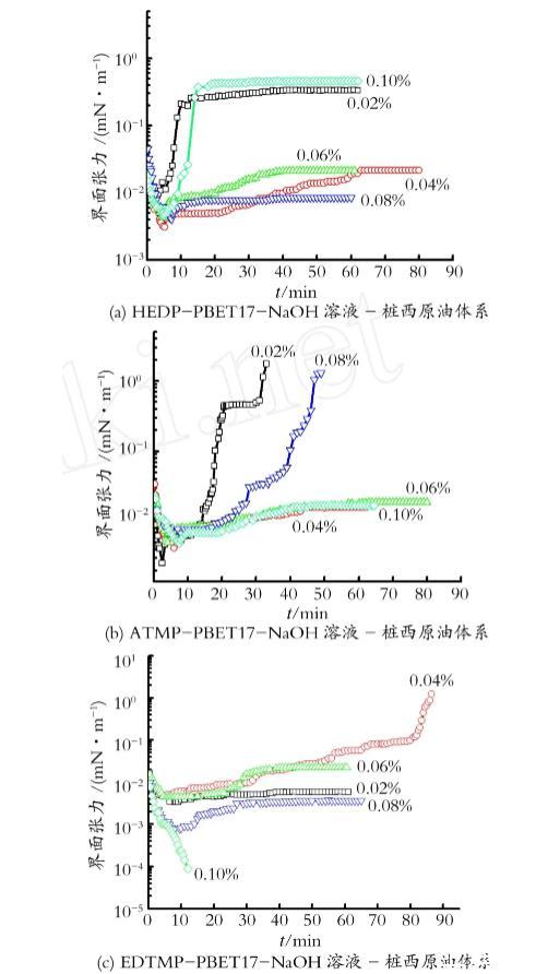 圖5 HEDP-PBET17-NaOH,A TM P-PBET17-NaOH,EDTM P-PBET17-NaOH溶液-樁西原油體系的動態界面張力