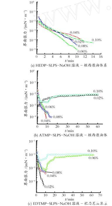 圖3 HEDP-SLPS-NaOH,A TM P-SLPS-NaOH,EDTM P-SLPS-NaOH溶液-樁西原油體系的動態界面張力