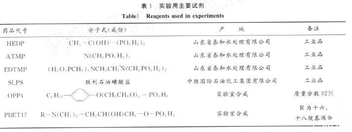 在化學驅提高采收率方法中,表面活性劑/堿復合驅的驅油效果比較好,這主要是由于堿與原油中酸性物質反應生成的活性劑與外加表面活性劑產生了協同效應,可以將油水界面張力降至低界面張力區域(10-2m N/m)甚至超低界面張力區域(10-3m N/m),并且堿可以降低活性劑在地層中的吸附。但在高堿濃度下,注入堿容易對驅油體系造成采出液處理困難、引起地層黏土分散和運移、導致地層滲透率下降等負面作用,并且堿也與油層流體及巖石礦物反應,形成堿垢,對地層造成傷害并影響油井正常生產。解決結垢問題的主要方法是加入化學防垢劑,其中有機膦酸鹽防垢劑因其良好的防垢效果而有廣泛的應用。