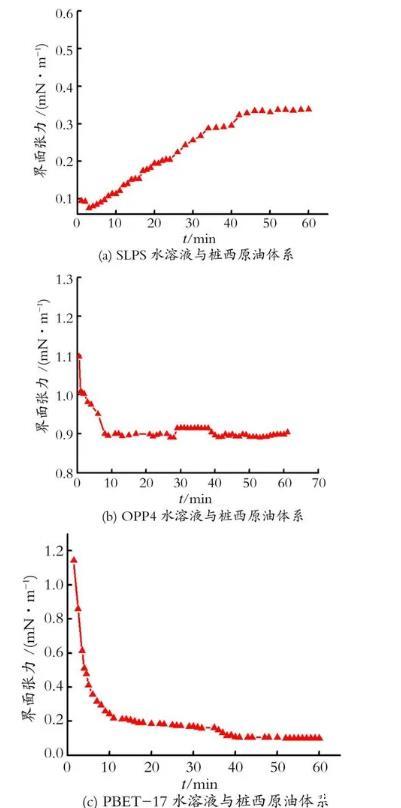 圖1 SLPS,OPP4和PBET-17水溶液-樁西原油體系油-水動態界面張力