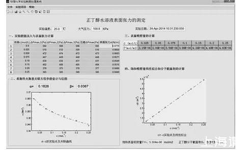 借助MATLAB工程計算平臺,通過程序設計完成了“正丁醇水溶液表面張力的測定”應用軟件的開發(fā)。在完成錄入壓差實驗數(shù)據后,不僅可以自動計算和填入溶液的表面張力,還能夠實現(xiàn)溶液表面張力與濃度定量關系的希斯科夫斯基經驗方程(Szyszkowski′s equation)中待估參數(shù)的求解,并用以求導供給吉布斯公式計算溶液的吸附量,進而推算溶液飽和吸附量和正丁醇分子的截面積。軟件的操作過程簡便、直觀、高效,避免了人工數(shù)據處理、繪圖的煩瑣和人為誤差,可提高實驗結果的準確性和重現(xiàn)性。