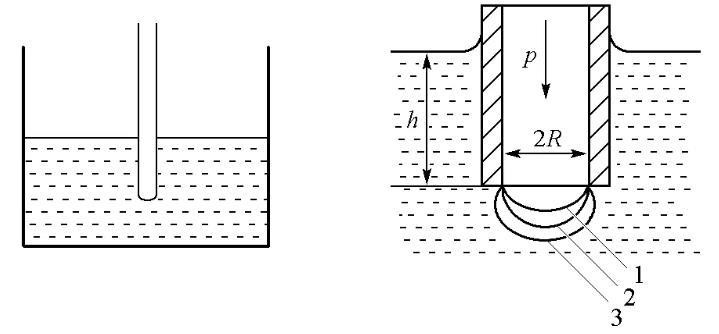 由于最大氣泡壓力法的器材易得,且易于學生理解表面張力的原理,因而一直是教學中測定液體表面張力的一種常用方法[2]。如圖1所示,測定時將一根毛細管插入待測液體內部,從管中緩慢地通入惰性氣體對其內的液體施以壓力,使管端形成氣泡逸出。當所用的毛細管管徑較小時,可以假定所產生的氣泡是球面的一部分;但是在氣泡生成及發(fā)展過程中,氣泡的曲率半徑會隨惰性氣體的壓力變化而改變。當氣泡的形狀恰為半球形時,氣泡的曲率半徑最小(即毛細管半徑R),此時根據Laplace方程,管內外壓差達最大,其值Δpmax=p-ρgh可由差壓計測量得到[3]。利用最大壓差和毛細管半徑即可計算表面張力σ: