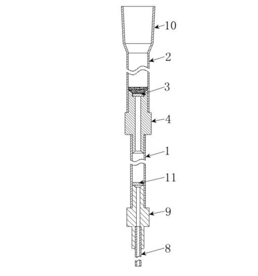 1、填料管;2、柱頭管;3、第一親水篩板;4、第一連接接頭;5、中部連接部;6、頂部連接部;7、底部連接部;8、適配管;9、第二連接接頭;10、加液口;11、第二親水篩板。