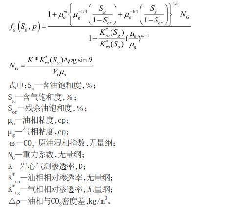 結(jié)合CO2黏度、原油黏度,推導(dǎo)出具有重力效應(yīng)的帶傾角儲層氣體分流率方程為: