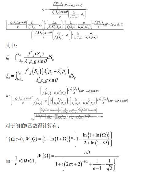將速度場方程與氣體分流率方程結(jié)合,在遵循氣體質(zhì)量守恒的基礎(chǔ)上,從CO2入口端到混相帶前緣對含氣飽和度進行積分,并用朗伯W函數(shù)求解得出混相前緣的位置,其表達式如下:
