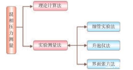 目前測(cè)量混相壓力的方法如圖3所示。國內(nèi)外許多專家研究了確定最小混相壓力的方法,包括理論計(jì)算和實(shí)驗(yàn)測(cè)定。但是,一般的理論計(jì)算精確度都不高,而實(shí)驗(yàn)測(cè)定方法具有較高的可靠性。實(shí)驗(yàn)測(cè)定方法包括細(xì)管實(shí)驗(yàn)、升泡儀法及界面張力法等。其中,界面張力法是通過直接測(cè)定注氣相與地層原油間的界面張力來確定最小混相壓力,既能觀測(cè)到形成混相的狀態(tài),而且操作時(shí)間也較短。細(xì)管實(shí)驗(yàn)法被認(rèn)為是最可靠的測(cè)量最小混相壓力方法,但細(xì)管實(shí)驗(yàn)也有局限性,不能模擬黏性指進(jìn)、重力超覆等因素,實(shí)驗(yàn)周期長,大約需要7~14天,且實(shí)驗(yàn)工作量大。升泡儀法是直接觀察混相過程,測(cè)量周期短,1h可以完成測(cè)量,測(cè)量結(jié)果受人為因素影響嚴(yán)重。而界面張力法是通過直接測(cè)定注氣相與地層原油間的界面張力來確定最小混相壓力,既能觀測(cè)到形成混相的狀態(tài),而且操作時(shí)間也較短,僅需5~6h。