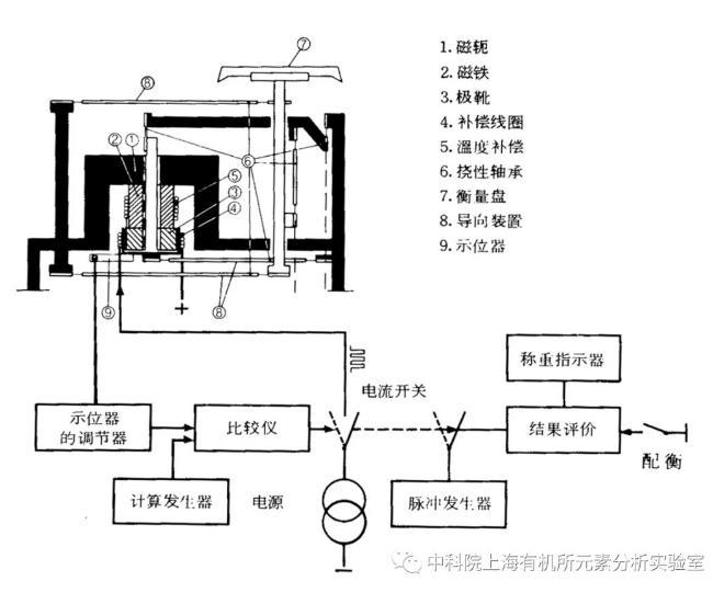 電子天平的結(jié)構(gòu)原理如上圖所示。包括衡量盤在內(nèi)的載荷接收裝置由兩對(duì)三角形導(dǎo)向裝置控制,衡量盤只能進(jìn)行垂直運(yùn)動(dòng)。磁鐵裝置由永久磁鐵組成,磁軛和極靴連接在載荷接收裝置的最下端,補(bǔ)償線圈放在磁鐵裝置的空氣間隙中。如果電流流往線圈,線圈中就產(chǎn)生直接向上的力,這種力作用于衡量盤上的重力。光電掃描裝置使這種力能辨別載荷接收裝置預(yù)先規(guī)定的中心位置。如果載荷有變位,調(diào)節(jié)器及其放大器就改變流經(jīng)線圈的電流,直到回到中心位置為止。在小載荷的情況下,電流通過(guò)時(shí)間短,載荷大時(shí)電流停留的時(shí)間長(zhǎng)。通電流的時(shí)間間隔是通過(guò)平衡位置掃描的可變?cè)鲆娣糯笃鱽?lái)調(diào)節(jié)的,而且這種時(shí)間間隔直接與載荷成正比。這樣,當(dāng)用加載的方式接通電流時(shí),就用計(jì)算器計(jì)算脈沖。當(dāng)測(cè)量結(jié)束時(shí),計(jì)算器指示其結(jié)果。概況來(lái)說(shuō),電磁力平衡式電子分析天平是把待測(cè)物的質(zhì)量通過(guò)電磁力平衡原理變換為電流檢測(cè),再經(jīng)電流/電壓變換、模/數(shù)轉(zhuǎn)換和數(shù)字化運(yùn)算處理,用數(shù)字顯示待測(cè)物的質(zhì)量值。