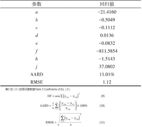 2.4.2實驗數據回歸及模型參數的求取本研究系統收集了文獻數據,并將研究測定的實驗數據,共計932個數據用于回歸,回歸所用數據見表2?;貧w參數由最小二乘法得到,其目標函數如式(9)所示。采用平均相對偏差(AARD)和均方根誤差(RMSE)表示計算效果,如式(10)、式(11)所示?;貧w結果見表3。