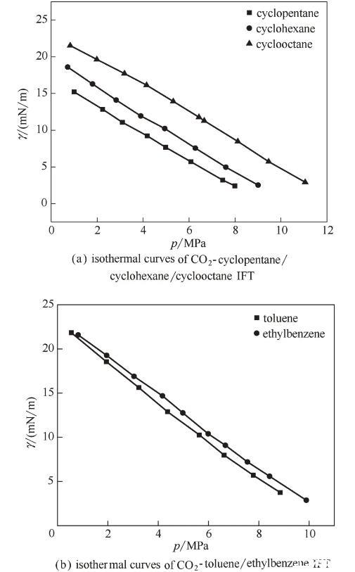 圖6 CO2-相似結構(環烷烴/芳香烴)界面張力的等溫線