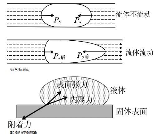 如圖4所示,當(dāng)流管中流體不流動(dòng)時(shí),流體中的氣泡呈橢球狀,兩邊對(duì)稱.但當(dāng)流體流動(dòng)時(shí)會(huì)造成氣泡的變形,沿流體前進(jìn)方向,氣泡前端被“拉伸”而變尖,曲率半徑變小;而后方被“推壓”而變凸,曲率半徑變大.由(2)式可知,前端的附件壓強(qiáng)PS前要比后端的附加壓強(qiáng)PS后大,從而造成流體流動(dòng)受阻.當(dāng)氣泡較多時(shí)阻力隨著增大,就造成了氣栓。