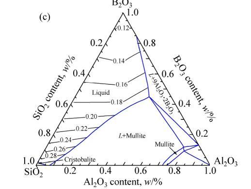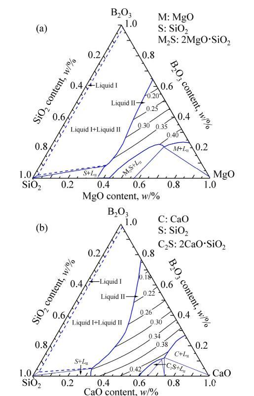 1873K時(shí)含B2O3三元體系等溫相圖及液相線如圖4所示。實(shí)際條件下,Si常存在于金屬相中,而SiO2則以硼硅酸鹽的形式存在于熔渣中,因此,SiO2添加對(duì)含B2O3三元體系熱力學(xué)性質(zhì)的影響仍有待確定,MgO-B2O3-SiO2、CaO-B2O3-SiO2和Al2O3-B2O3-SiO2三元系相圖也需要進(jìn)一步優(yōu)化。1873K時(shí)含B2O3三元體系熔渣等表面張力線如圖4所示。結(jié)果表明,在MgO-B2O3-SiO2體系和CaO-B2O3-SiO2體系1873K完全液相區(qū)(Liquid II)范圍內(nèi),熔渣表面張力值在0.15~0.45 N/m范圍內(nèi);隨著B2O3含量的增加,表面張力顯著降低;隨著SiO2含量、MgO含量和CaO含量的增加,熔渣表面張力逐漸增大,但MgO含量和CaO含量對(duì)表面張力的影響更加顯著。在Al2O3-B2O3-SiO2體系1873K完全液相區(qū)(Liquid)范圍內(nèi),熔渣表面張力在0.10~0.30 N/m范圍內(nèi);熔渣表面張力隨B2O3含量的增加而逐漸減小,隨SiO2含量和Al2O3含量的增加而逐漸增大。