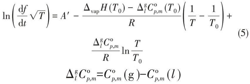 Verevkin等[54]開發(fā)了評估程序的物理基礎(chǔ),并使用1-乙基-3-甲基咪唑雙(三氟甲磺?;?酰亞胺[C2mim][Tf2N]進行測量,從而將蒸發(fā)焓的測量范圍降低到363 K。和文獻中已有的數(shù)據(jù)相比較,具有一致性。這項工作中開發(fā)的方法也為得到ILs的汽化焓開辟了一條新途徑。經(jīng)過一系列公式推導(dǎo),構(gòu)建了ILs的摩爾汽化焓、頻率損耗率df/dt和溫度的關(guān)系