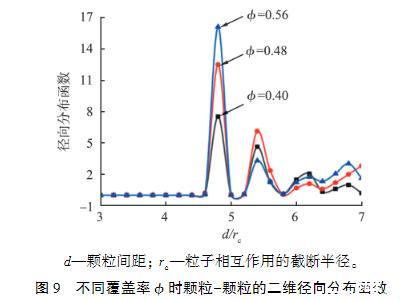 圖9不同覆蓋率?時顆粒-顆粒的二維徑向分布函數為了研究界面顆粒覆蓋率對界面張力的影響,建立了底面邊長為30rc、高度為40rc的正方體模擬區域來容納更多的顆粒,分別將不同數量的顆粒隨機放置于界面上,并采用2種方法計算不同顆粒覆蓋率下的界面張力。