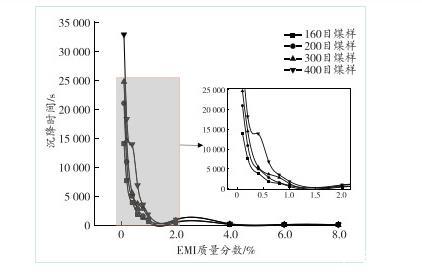 從圖8可以看出,160目測試煤樣在EMI質量分數低的溶液中,煤塵的沉降速度較慢,且變化率較小,隨著溶液中EMI質量分數的增大所需沉降時間明顯縮短,沉降速度逐漸增大;當EMI質量分數相同時,相比于160目測試煤樣,200目測試煤樣所需沉降時間更長,沉降速度相對較慢。隨著溶液中EMI質量分數的增大,200目測試煤樣完全沉降所需時間明顯縮短;從整體來看,300目測試煤樣隨溶液中EMI質量分數的增大在沉降過程中所需時間縮短較為明顯,沉降時間總體縮短約99.8%;而400目測試煤樣相比于其他3組測試煤樣來說,所需的沉降時間最長,受EMI質量分數影響最明顯。