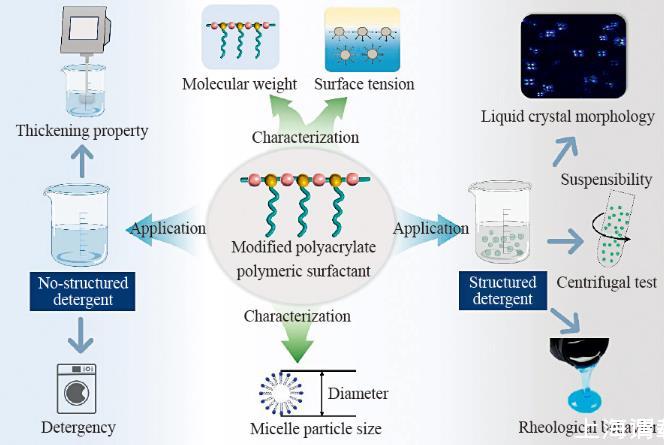 高分子表面活性劑,是指分子結(jié)構(gòu)中含有親水和疏水基團(tuán),且相對分子量在數(shù)千以上的化合物。與低分子量的表面活性劑相比,大部分高分子表面活性劑的表面活性較弱,滲透性和起泡性差,但分散、乳化以及絮凝等性能較好。因此,在織物洗滌劑中,高分子表面活性劑常常被用作聚合物。然而,不可否認(rèn),高分子表面活性劑在洗滌劑中時,除了對黏度、去污力等表觀性能有影響外,其復(fù)雜的結(jié)構(gòu)和高分子量也會影響表面活性劑復(fù)配體系的微觀表現(xiàn):如膠束聚集行為、液晶形態(tài)等等。作為一種新型的特殊表面活性劑,探究高分子表面活性劑在洗滌體系中的應(yīng)用將有利于織物洗滌技術(shù)的革新。