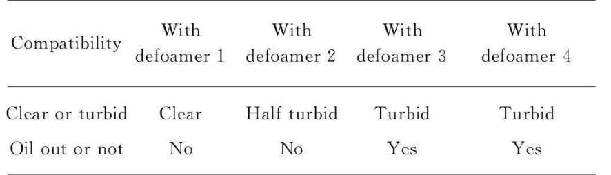 消泡劑的消泡能力與乳液的相容性成反比關系。消泡劑1和2與乳液的相容性最好,但因為部分溶解于乳液中,使消泡強度減弱;而消泡劑4與乳液的相容性最差,雖然具有極強的消泡性,但是因為過于疏水而難與乳液相容,所以容易造成表面缺陷。消泡劑3與乳液的相容性與消泡能力較為平衡,是最佳的消泡劑選擇。