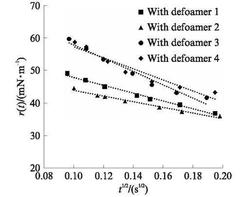 擴散系數是指單位時間內物質通過單位擴散通道橫截面的質量。擴散系數越大,物質擴散能力越強。利用擬合曲線斜率代入式(1),可以求得消泡劑在起泡液中極短時間范圍的擴散系數,消泡劑1、2、3、4的擴散系數D分別為4.67×10-6、2.43×10-6、1.33×10-5、9.24×10-6m2/s,在10-5到10-6數量級。
