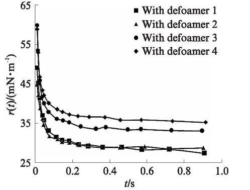 圖1是添加消泡劑后起泡液(0.2%二異辛基琥珀磺酸鈉鹽水溶液)的動態表面張力r(t)與時間t的關系圖。由圖1可以看出:在同樣的添加量下,分子級消泡劑(消泡劑1、2)可使起泡液具有更低的動態表面張力,這與其雙子結構有關;有機消泡劑(消泡劑3、4)在起泡物質的協同作用下,也具有一定的降低起泡液動態表面張力的能力;在起泡液中,不論是加入分子級消泡劑還是有機消泡劑,在時間趨于1s時,其表面張力都低于36mN/m.