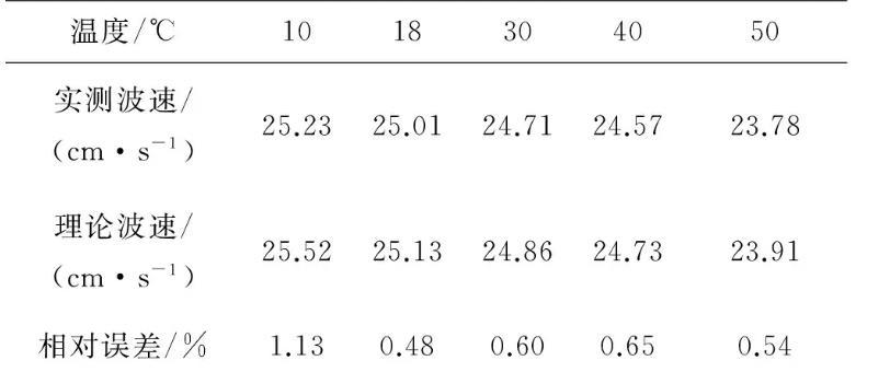 將之前得到的多組表面張力系數(shù)和波長數(shù)據(jù)代入式(1)中計算理論波速,再與實驗中的實測波速作比較,便可以通過實驗驗證水波波速與其表面張力關(guān)系公式的的正確性。在不同溫度下,實際測得的波速、由原理公式計算出的理論波速以及兩者的相對誤差數(shù)據(jù)列于表5。