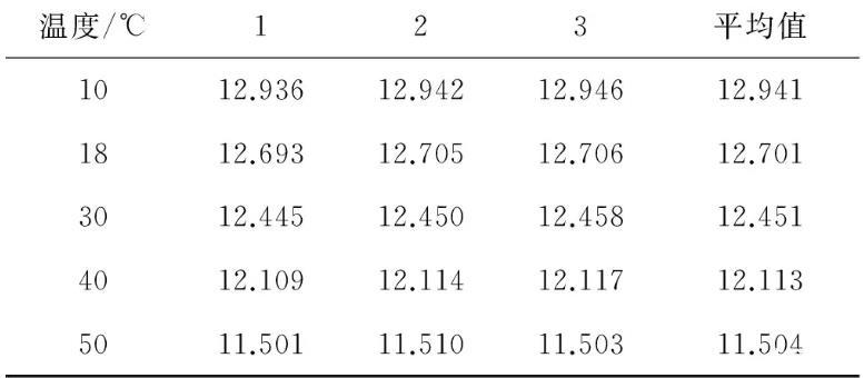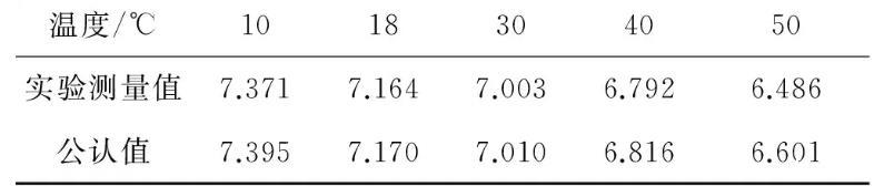 將不等徑U型管內(nèi)徑以及液位差的測量數(shù)據(jù)代入式(8)中,計算得到對應(yīng)溫度下的表面張力系數(shù)的測量值。查閱已有文獻,可以得到不同溫度下純凈水表面張力系數(shù)的公認值以及數(shù)據(jù)擬合出的公式α=75.45067-0.13326t-5.26468×10-4t2.實驗測量值與公認值對比列于表3.