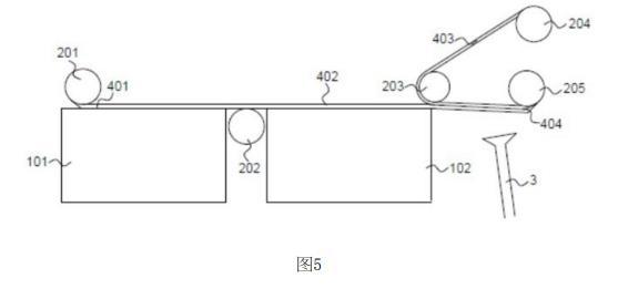 貼合輥203,設于清洗槽的尾端上方,清洗液的上表面與貼合輥底部之間的間隙不大于多層石墨烯薄膜與目標基底的厚度之和。當貼合輥旋轉時,會將目標基底卷到多層石墨烯薄膜的上表面,借助摩擦力將目標基底與多層石墨烯薄膜貼合,得到石墨烯薄膜包裹的電化學陽極404;