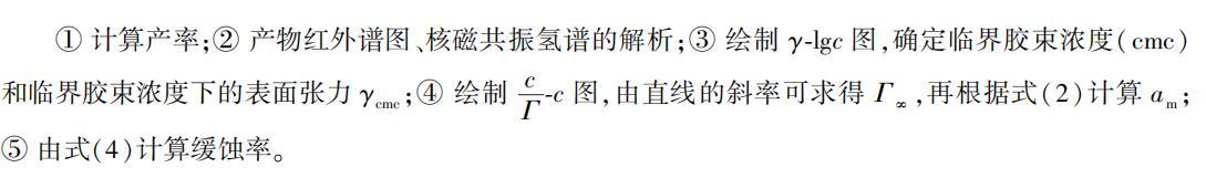 儀器:NEXUS470傅立葉紅外光譜儀,Bruker AVANCE III核磁共振儀,R-1002旋轉(zhuǎn)蒸發(fā)儀,WRS-1B數(shù)字熔點(diǎn)儀,DZ-2BC真空干燥箱,JJ-1電動(dòng)攪拌器,恒溫水浴鍋,JK99B自動(dòng)張力儀,BS-210S電子天平,干燥器,N80鋼片(長伊寬伊高=40mm伊13mm伊2mm),醫(yī)用紗布,毛刷,醫(yī)用金屬鑷子,脫脂棉,綢子,鐵砂紙,250mL三口燒瓶1只,回流冷凝管等。