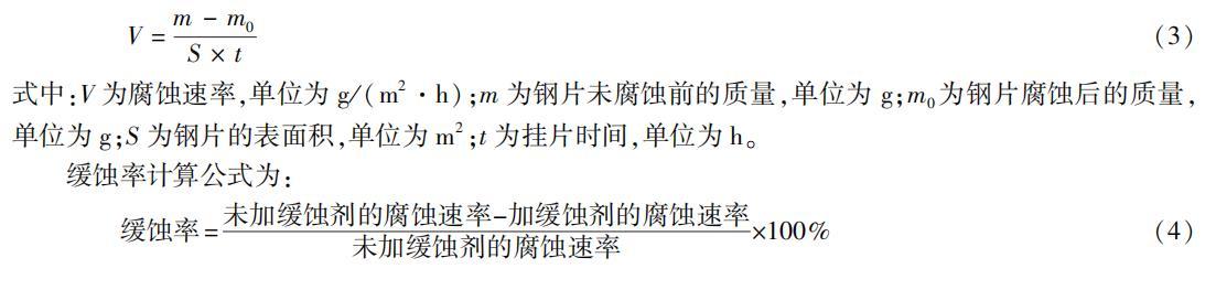 用毛刷和紗布擦拭鋼片表面的腐蝕產(chǎn)物,然后用自來水沖洗干凈,用醫(yī)用紗布擦干。將鋼片依次放入石油醚、丙酮、無水乙醇中各浸泡5min,取出鋼片用綢子擦拭,然后用冷風(fēng)吹干,放入干燥器中干燥4h以上。在分析天平上準(zhǔn)確稱重(精確至0.1mg)并記錄。