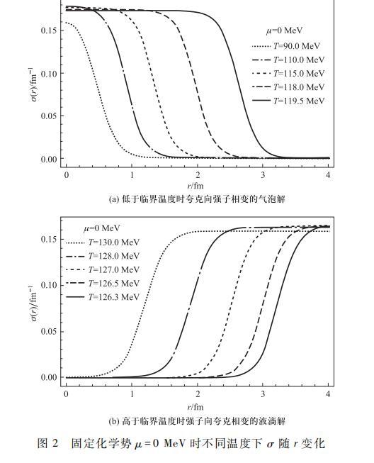 值得指出的是,對于液滴解,由圖1可以看出在更高溫度時,在σ=σv處的極小值將會消失,即偽真空消失。此時全空間將是均勻的夸克相,相變已經完成,液滴解也隨之消失,所以在更高溫度區域不存在液滴解。