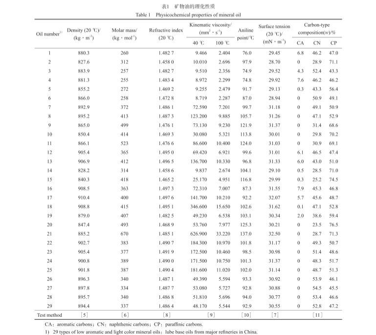 29種常見的低芳淺色礦物油:取自國內(nèi)主要煉油廠的潤滑油基礎(chǔ)油,包括主要的石蠟基基礎(chǔ)油和環(huán)烷基基礎(chǔ)油,不包括深色高芳烴礦物油;從精制程度看,包括高壓加氫深度精制油品,也包括溶劑精制和白土精制工藝精制油品;從碳型結(jié)構(gòu)看,包括芳環(huán)碳(CA)含量為零的油品,也包括CA含量小于10%(w)的油品。礦物油的理化性質(zhì)見表1。