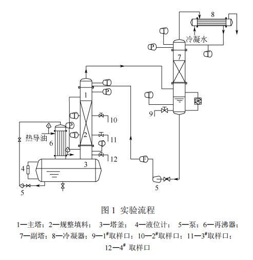 實驗流程如圖1所示。實驗裝置由主塔、副塔、冷凝系統、加熱系統四大部分組成。主塔為內徑400mm的不銹鋼精餾塔,填料層裝填高度1.8m,每盤填料高200mm,共9盤。主塔塔頂上升蒸汽及其冷凝液在副塔內進行換熱,得到飽和的回流液,避免過冷現象的發生。塔釜再沸器采用熱導油加熱,換熱面積為27.5m2。塔頂冷凝器采用冷卻水制冷,換熱面積為29.9m2。實驗采用常壓下的全回流操作。