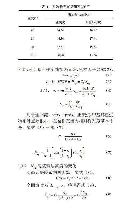 由4個取樣口的組成數據可以計算填料塔的理論板當量高度,根據定義有式(1)。