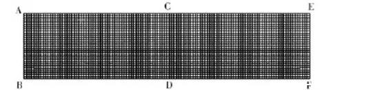 采用聚合物專用流體分析軟件Polyflow,對(duì)圓形截面的流道進(jìn)行模擬分析,探討表面張力的尺寸效應(yīng)及表面張力系數(shù)和接觸角對(duì)微擠出流場(chǎng)的影響。由于流道結(jié)構(gòu)及流場(chǎng)的對(duì)稱性,本模擬采用軸對(duì)稱分析。模擬分析的流道尺寸及網(wǎng)格劃分如圖2所示。微通道尺寸AE=4×AB=1.2mm。網(wǎng)格采用四邊形結(jié)構(gòu)單元。節(jié)點(diǎn)數(shù)量為3751,網(wǎng)格數(shù)量為3600。