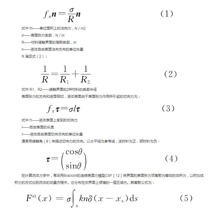 在計(jì)算流體力學(xué)中,常采用Brackbill的連續(xù)表面力模型CSF 將界面的表面張力項(xiàng)離散為等效的體積力,以附加體積力的方式加到流體的動(dòng)量方程中。它分布在交界面上很薄的一層區(qū)域內(nèi)。其離散公式為: