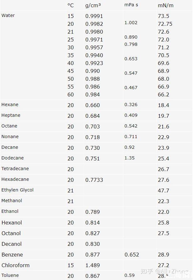 只有少數(shù)樣品可用于此類試驗(yàn)測量。下表提供了一些此類液體的重要數(shù)據(jù)。這些數(shù)值由不同的作者和方法確定,可以作為標(biāo)準(zhǔn)。