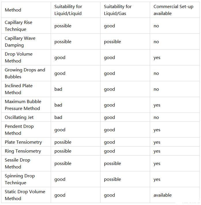 有些方法基于動(dòng)力學(xué)原理,因此適合測量張力隨時(shí)間的變化。其他方法是靜態(tài)或準(zhǔn)靜態(tài)方法,也產(chǎn)生動(dòng)態(tài)張力,但也允許接近液體界面的平衡狀態(tài),因此能夠測量平衡張力。動(dòng)態(tài)方法需要考慮動(dòng)態(tài)特性的數(shù)據(jù)解釋理論,而靜態(tài)方法的數(shù)據(jù)更容易理解。