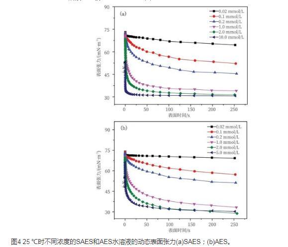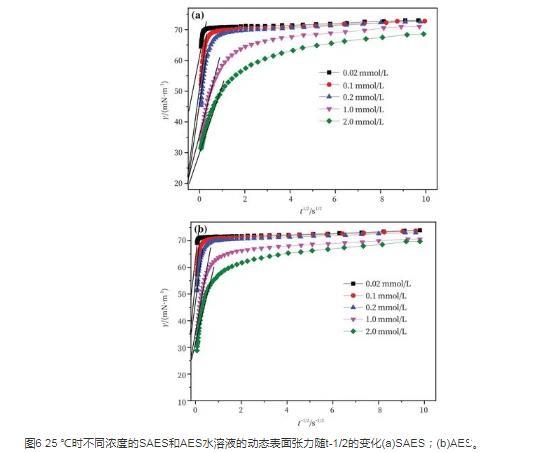 從圖4可以看出所測不同濃度不同表面活性劑的表面張力在初始階段均快速下降,一定時間后趨于平穩(wěn)狀態(tài)。這是因為動態(tài)表面張力測試過程中新形成的表面遠偏離于平衡態(tài),吸附層離子的濃度很低,體相與吸附層的濃度差大,因此動態(tài)表面張力變化很大。隨著吸附的進行,次表面濃度和表面濃度逐漸增大,擴散和吸附的速度均逐漸降低,動態(tài)表面張力隨著吸附時間的增加而降低的趨勢也逐漸變得平緩。當(dāng)表面活性劑濃度增大時,表面張力的下降幅度和速度也隨之增大,而且相應(yīng)地縮短了到達平衡狀態(tài)的時間。這種隨體系濃度的增加達到平衡所需的時間越短的趨勢與已經(jīng)報道的一些烷基表面活性劑的結(jié)果是相一致的。在相同濃度下,SAES表面張力下降的速率大于AES,這是由于SO4-在碳?xì)滏溨虚g的化合物比在端點者擴散速度快。