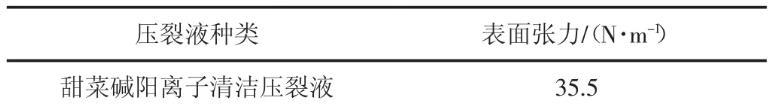 由表3可知,甜菜堿陽(yáng)離子清潔壓裂液的破膠液的表面張力比水的表面張力明顯要低,為35.5 N/m。壓裂液易于返排,對(duì)油氣層的損害低。