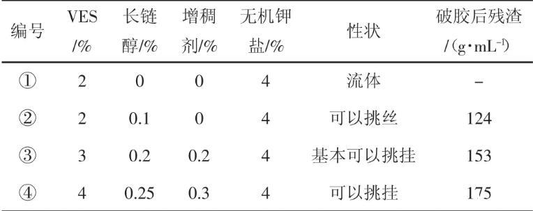 由表1可知④號(hào)配方當(dāng)VES的含量為4%,長(zhǎng)鏈醇為0.25%,無機(jī)鉀鹽含量為4%,增稠劑含量為0.3%時(shí)可以挑掛且殘?jiān)可伲瑸樽罴训呐浔取L鸩藟A型陽(yáng)離子清潔壓裂液的配方(見表2)。