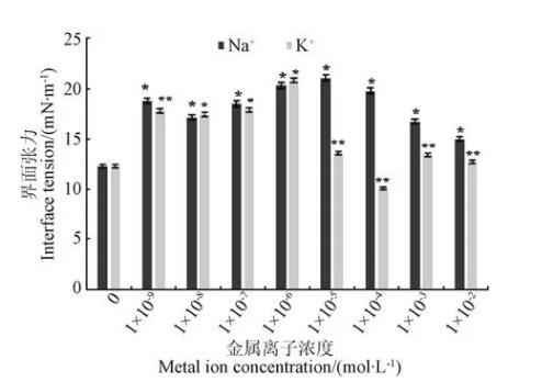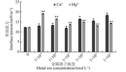 2)在麥胚脂肪酶的作用底物,即三油酸甘油酯(10-5mol/L)存在時,添加濃度分別為10-6、10-6、10-4和10-9mol/L的Na+、K+、Ca2+、Mg2+均可一定程度上降低油水界面張力的加入降低了三油酸甘油酯存在時的油水界面張力,其中,Mg2+的作用效果最明顯(P<0.05)。當麥胚脂肪酶的作用產物油酸(5×10-4mol/L)存在時,添加NaCl和KCl可降低油水界面張力。添加CaCl2和MgCl2可升高油水界面張力,其中Na+的作用效果最顯著(P<0.05)。