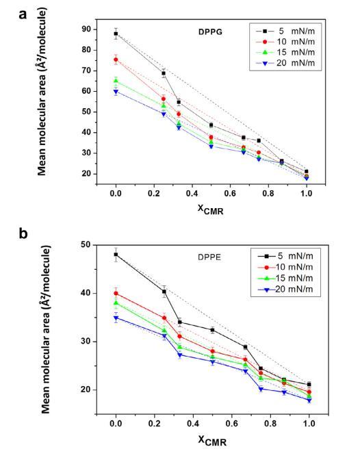 純和混合單層的 pA 等溫線與分子面積的關系如圖 1 所示。CMR/DPPG 等溫線顯示出與純 DPPG 脂質相似的趨勢(圖 1a)。 相似相 對所有 CMR/DPPG 混合物都觀察到了轉變。 DPPG 和 DPPC 顯示崩潰壓力 (DPcoll) 為 52 mN.m-1 次方和 60 mN.m-1次方 , 分別。 一個過渡 (p ffi 3 mN.m-1次方 ) 從液體 發現純 DPPE 單層膨脹為凝聚相 與 D. coll 在 ffi55 mN.m-1次方 . 為 D. coll 獲得的值 純脂質與文獻一致(Vollhardt 等人, 2000; 諾沃塔斯卡等人,2014 年)。