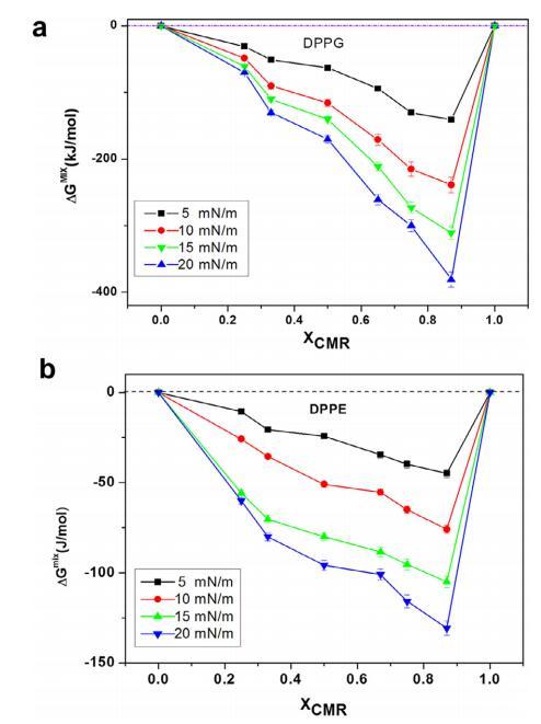 CMR/DPPG 混合膜的 ?Ge 和 ?Gmix 表示負 從 XCMR ≥ 0.25 到 XCMR = 1.0 的偏差(圖 7a 和 8a)。 ?Ge 和 ?Gmix 負值表明 CMR/DPPE 單層是 熱力學穩定(圖 7b)。 ?Ge 和 ?Gmix 值為 DPPC 混合單層陽性,表明不混溶 (圖 7c 和 8c)。 分子之間的距離取決于 在導致排斥的磷脂頭部基團上 互動(邁爾斯,1999 年;博格斯,1987 年)。