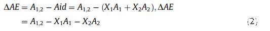 其中 A1,2 是 mma,Aid 是理想的混合單層,X1 和 X2 分別是組分 1 和 2 的摩爾分數。 A1 和 A2 是相同表面壓力下每分子純單分子層的相應面積。 DAE 值變為零 當物質形成理想混合物或不混溶時 (瓊斯和查普曼,1996 年)。
