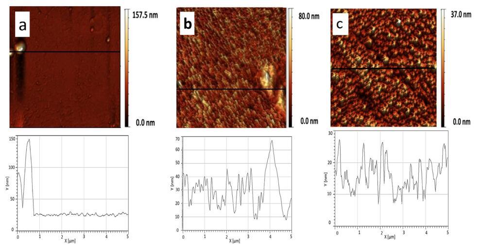 圖 9 顯示了純磷脂單層的 AFM 圖像 在 p = 20 mN/m 時轉移。 純磷脂顯示出均勻的 均方根 (rms) 等于 0.219 nm 的圖案, DPPG、DPPE 和 DPPC 分別為 0.060 nm 和 0.054 nm (圖 9)。 我們獲得了 rms ~ 0.045 nm (XCMR = 0.87) 相當于 光滑的單層形貌(圖 10a)。 另一方面, CMR/DPPE 和 CMR/DPPC 薄膜對應于粗糙表面 rms 分別為 0.1754 nm 和 0.072 nm(圖 10b 和 c)。 測量重復三次,rms 的標準偏差約為 5%。