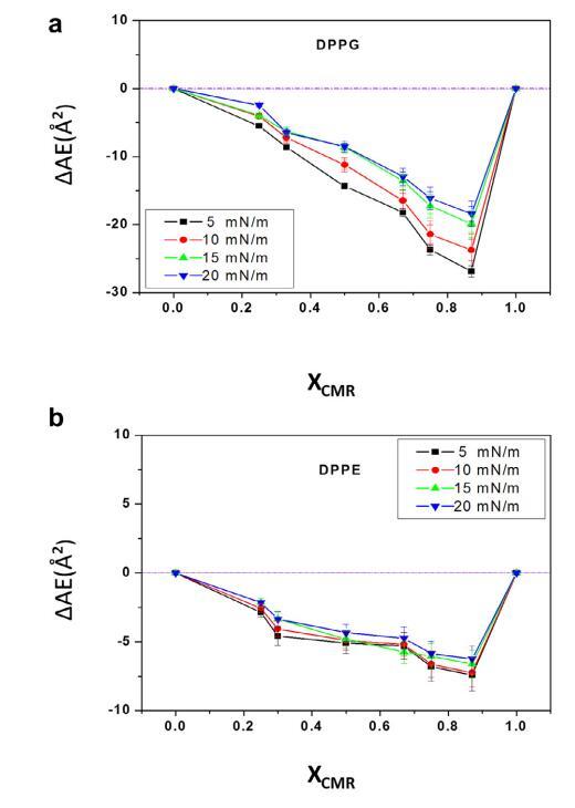 分子面積作為 CMR/ DPPG如圖5a所示。 可以看出負偏差 mma (XCMR = 0.33–0.67) 由于分子吸引力相互作用的增加。 CMR/DPPG 薄膜被認為是部分混溶和非理想的浮動單層,因為線性度不高 觀察到的。 CMR/DPPE 混合薄膜的結果在 XCMR=0.25 和 0.67 時表現出不同的斷裂點(圖 5b)。 DAE 節目 包裝效率甚至幾何形狀的改進 調節發生在較低的 XCMR(圖 6)(Andrade 等人, 2006; 周和張,2000)。