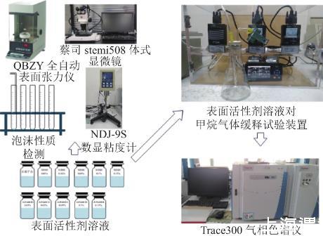 試驗流程如圖1所示。將兩種表面活性劑配置質(zhì)量分數(shù)為0.01%、0.02%、0.05%、0.1%、0.15%的溶液,使用QBZY全自動表面張力儀對不同質(zhì)量分數(shù)表面活性劑溶液以及去離子水進行表面張力測量,NDJ-9S數(shù)顯粘度計測表面活性劑溶液黏度,注氣法檢測溶液泡沫性質(zhì),蔡司stemi508體式顯微鏡觀察泡沫形態(tài)。上述基礎參數(shù)測定結(jié)束后,使用自行研制的表面活性劑溶液對甲烷緩釋試驗裝置進行泡沫對甲烷緩釋效應影響試驗,并采用Trace300氣相色譜儀定量檢測分析。