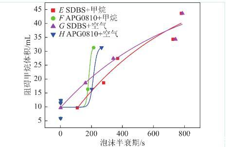 圖15為表面活性劑溶液泡沫中甲烷體積隨泡沫半衰期變化的曲線,半衰期包括甲烷泡沫半衰期和空氣泡沫半衰期。擬合度均在0.9以上,且均隨著泡沫穩(wěn)定性增強(qiáng),泡沫對甲烷的緩釋作用越強(qiáng)。
