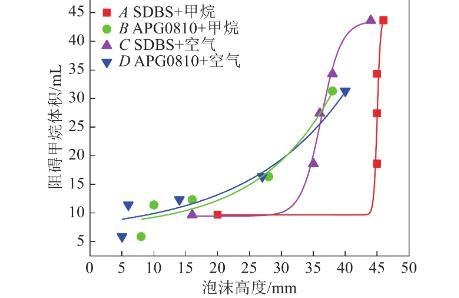 4)泡沫穩(wěn)定性是決定甲烷緩釋效應(yīng)的關(guān)鍵因素,泡沫穩(wěn)定性越強(qiáng),越能有效控制甲烷流動。可直接采取空氣-表面活性劑泡沫的各項參數(shù)表示泡沫性質(zhì)。陰離子表面活性劑SDBS表現(xiàn)較好,泡沫穩(wěn)定性較強(qiáng),隨著時間推移,SDBS也有比APG0810更好控制甲烷釋放的效果。質(zhì)量分?jǐn)?shù)為0.15%時,10 min內(nèi)SDBS可以控制約占總通入甲烷體積87%的甲烷。120 min后仍可控制約占通入總體積49.16%的甲烷。