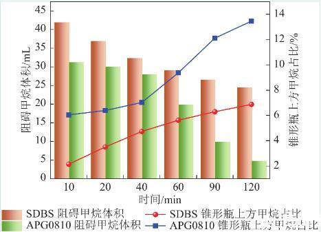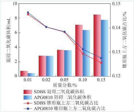 圖12為注入二氧化碳的氣相色譜檢測結(jié)果,計算出表面活性劑泡沫對二氧化碳的緩釋作用結(jié)果如圖12柱狀圖所示。相同質(zhì)量分?jǐn)?shù)下,SDBS溶液對二氧化碳的緩釋效應(yīng)優(yōu)于APG0810。然而兩種表面活性劑對二氧化碳緩釋效應(yīng)均不顯著,SDBS表面活性劑溶液在質(zhì)量分?jǐn)?shù)最大時10 min內(nèi)只控制了8.46 mL二氧化碳?xì)怏w,APG0810只控制了7.74 mL二氧化碳?xì)怏w。